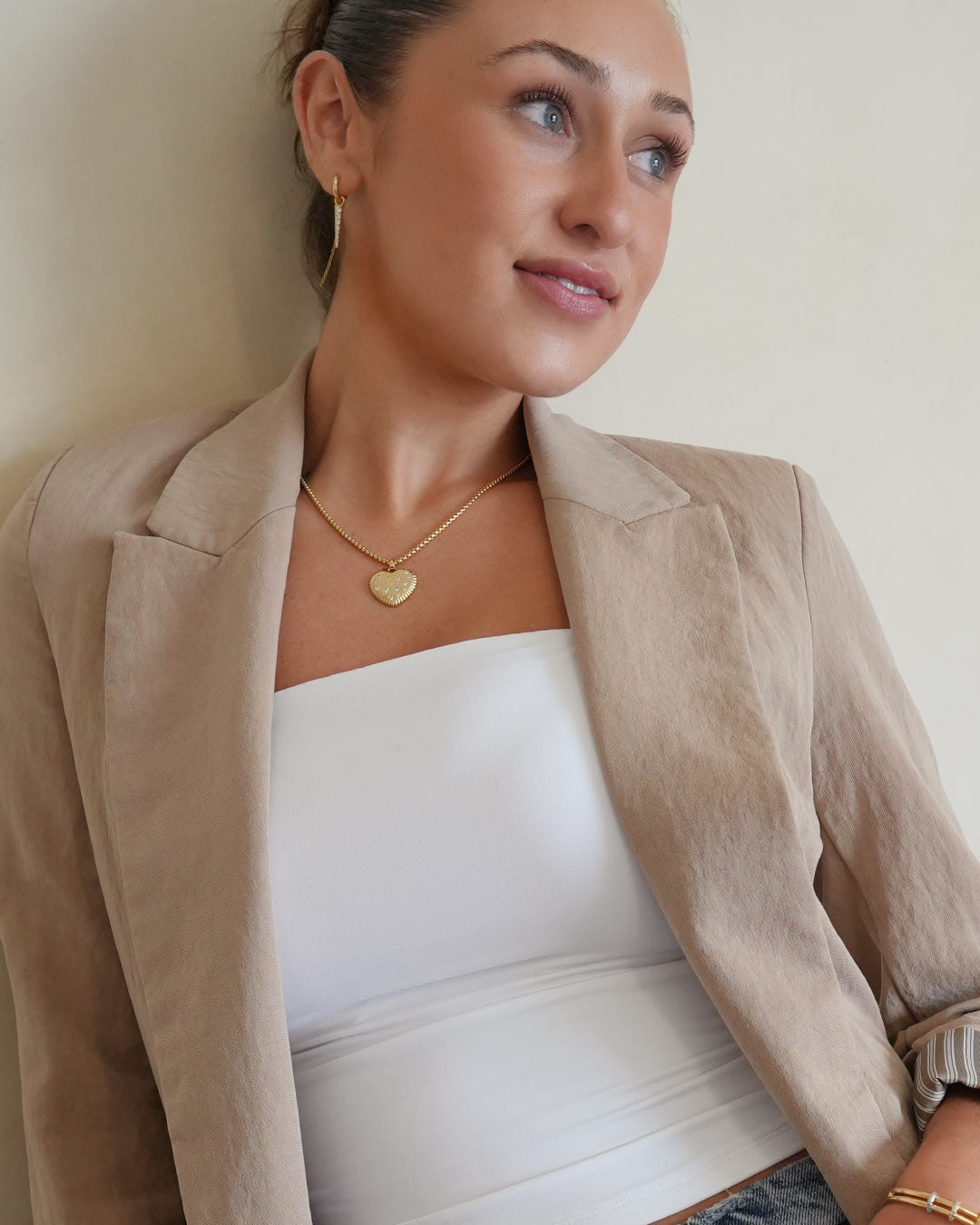 Part of our Architect Collection, The Stamp Necklace features a removable heart-shaped pendant with mosaic set cubic zirconia stones, and an 18 inch box link chain.